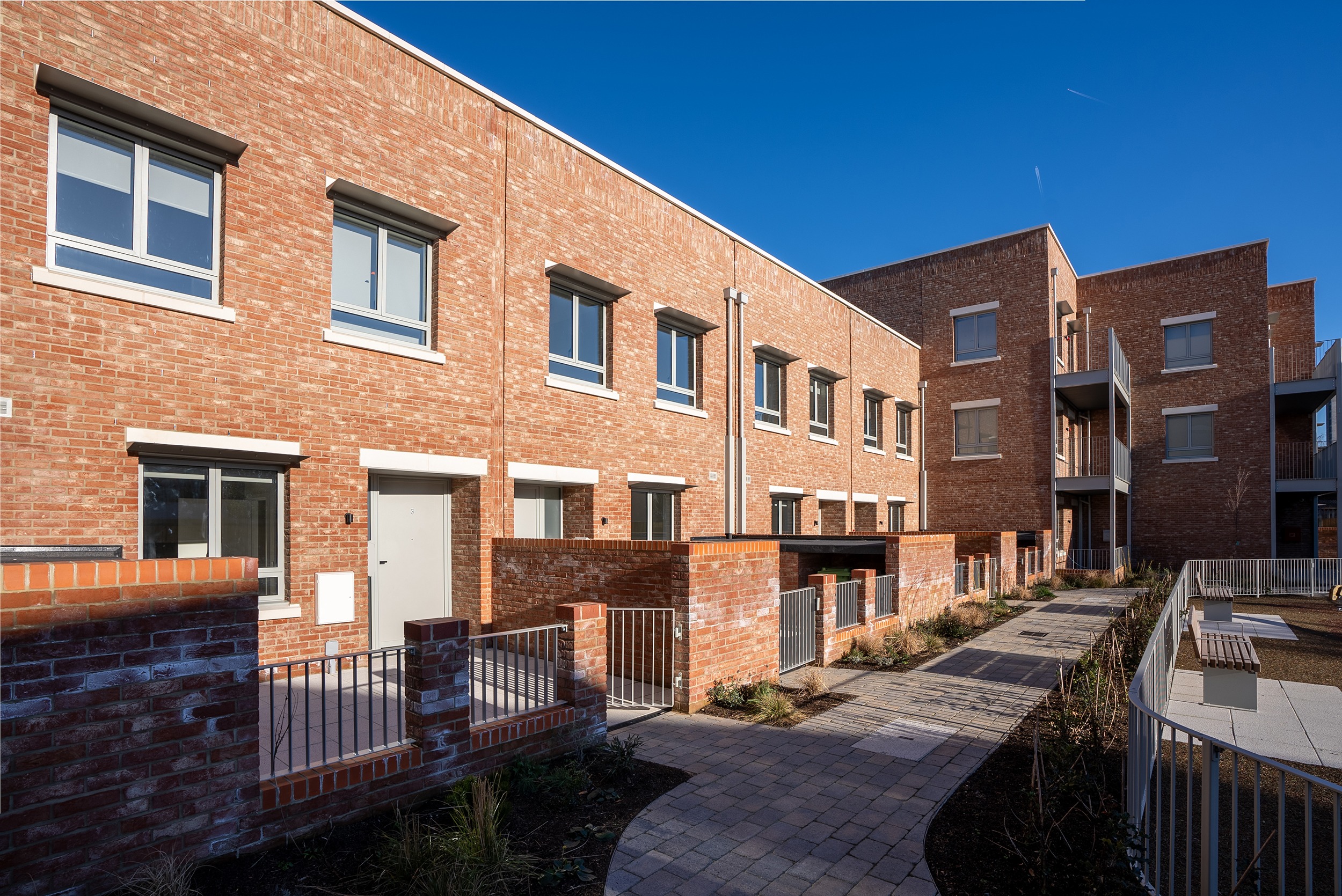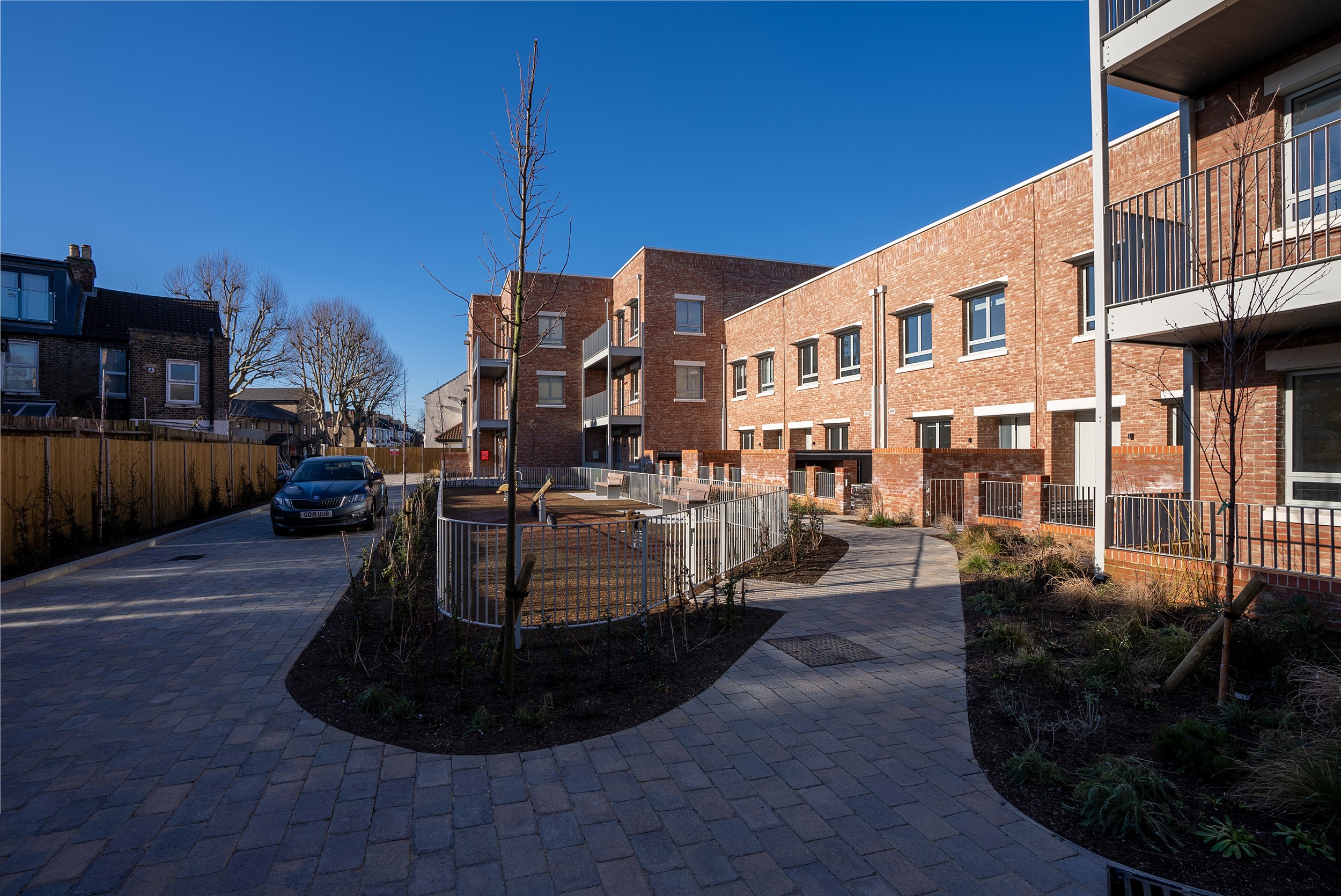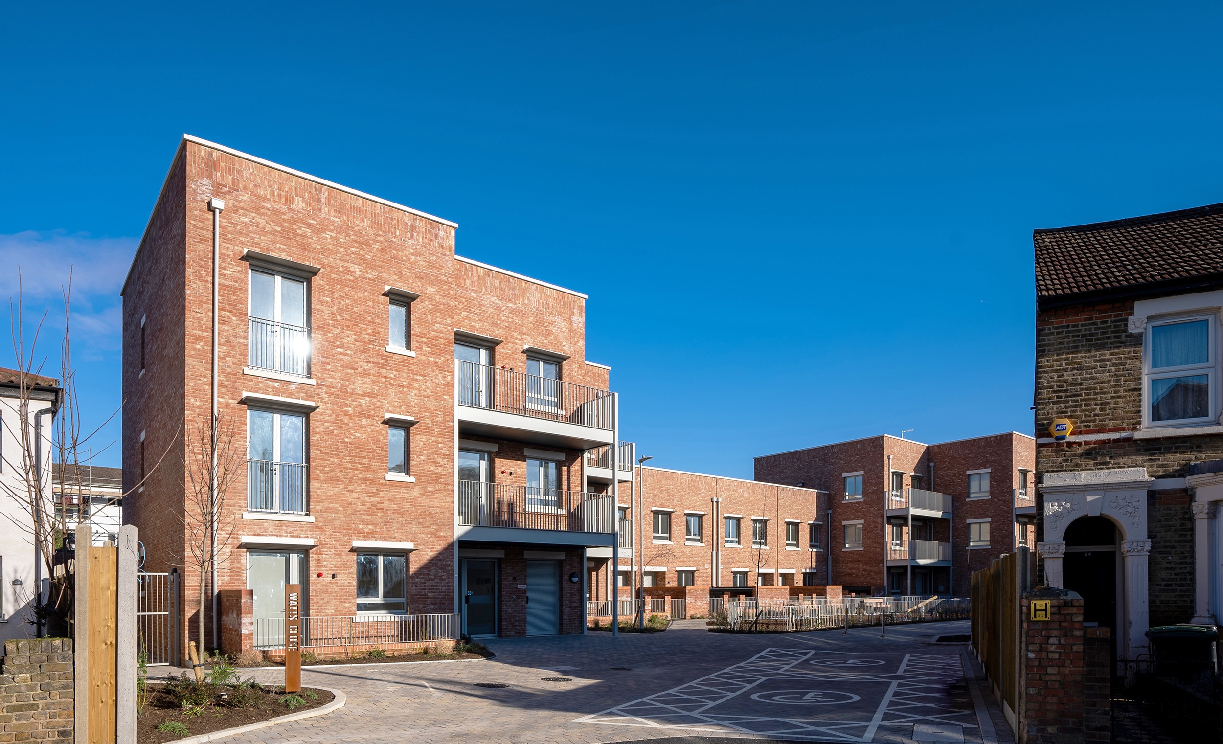 The design integrates the isolated site into the urban network and creates a sense of place at Watts Close. A legible pedestrian route through the site connects the two streets to the east and west of the site, while the alignment of new buildings responds to the adjacent terraced houses, achieving a clear definition of the private and public realm and creating a central open space. The massing and frontages of the two flat blocks are broken down to a modest domestic scale similar to the fine grain of nearby houses. The simple design reinterprets details and materials of the surrounding context using a modern architectural expression.