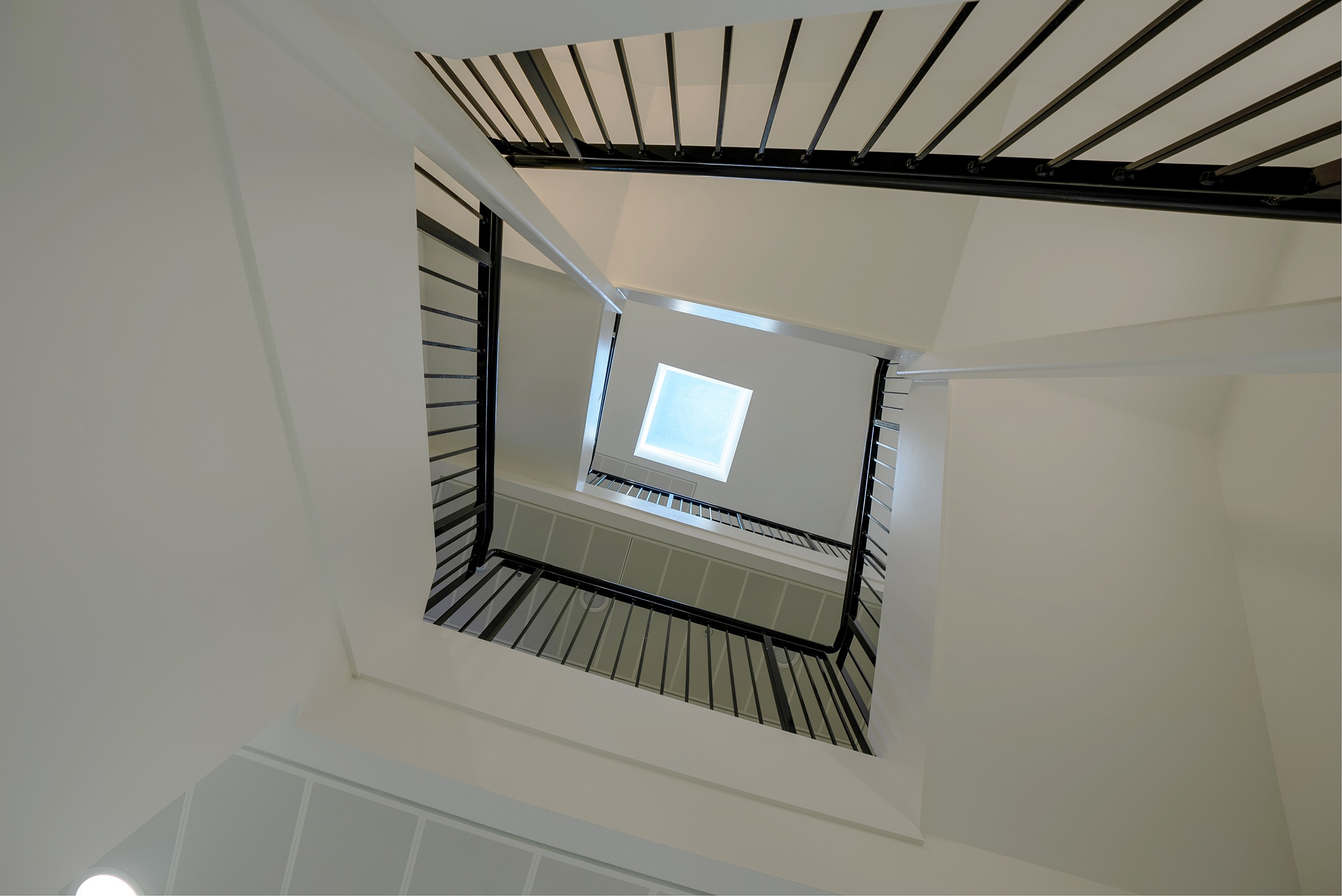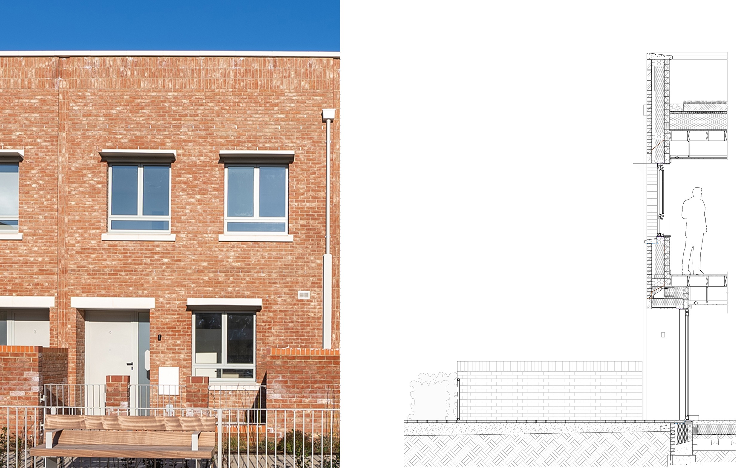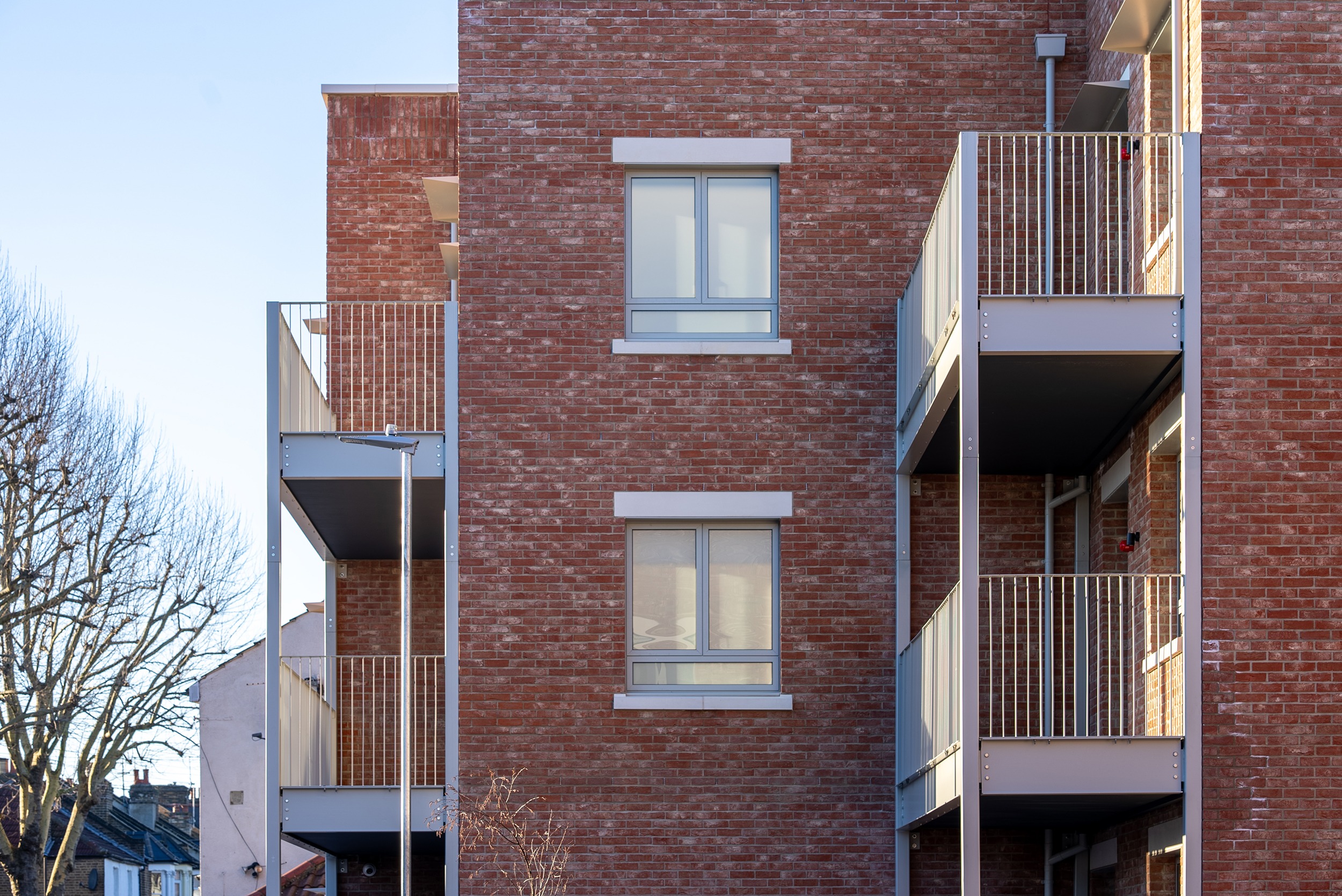 The design integrates the isolated site into the urban network and creates a sense of place at Watts Close. A legible pedestrian route through the site connects the two streets to the east and west of the site, while the alignment of new buildings responds to the adjacent terraced houses, achieving a clear definition of the private and public realm and creating a central open space. The massing and frontages of the two flat blocks are broken down to a modest domestic scale similar to the fine grain of nearby houses. The simple design reinterprets details and materials of the surrounding context using a modern architectural expression.
